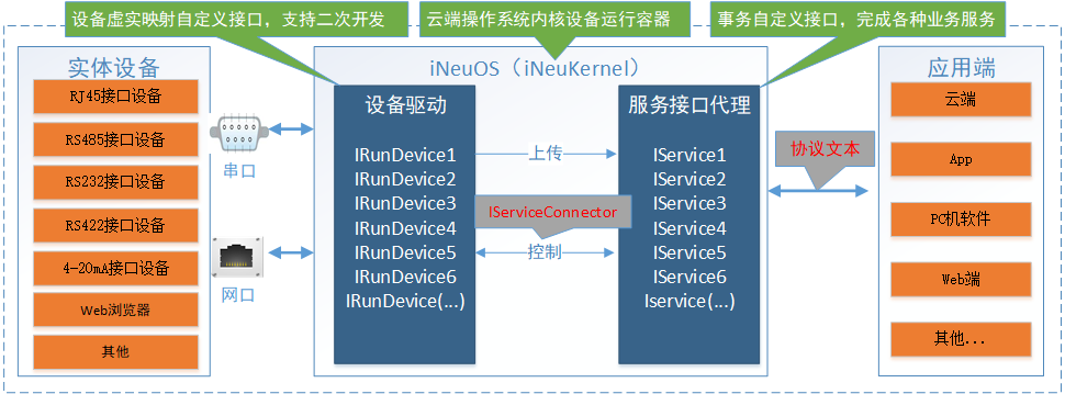 iNeuKernel是iNeuOS内核设备运行容器,是以物理设备或传感器为核心构建的框架,可以随意挂载设备驱动在内容容器下运行,总体协调设备驱动(协议)、IO通道(COM和NET)、运行机制(模式)之间的协作机制,使之无缝结合、运行,支持二次开发。
