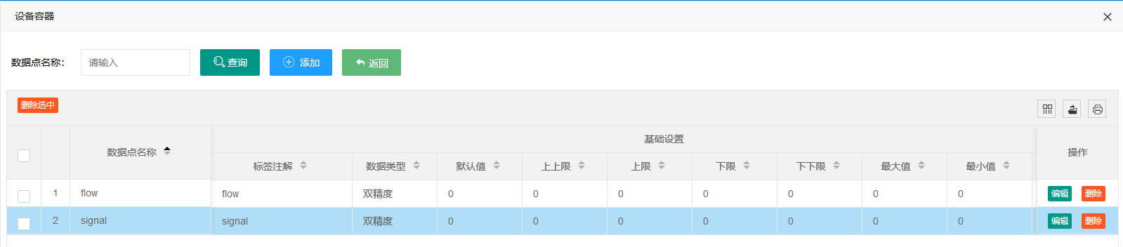 设备管理的物模型,包括:设备基本信息、数据点管理、计算及预警等。