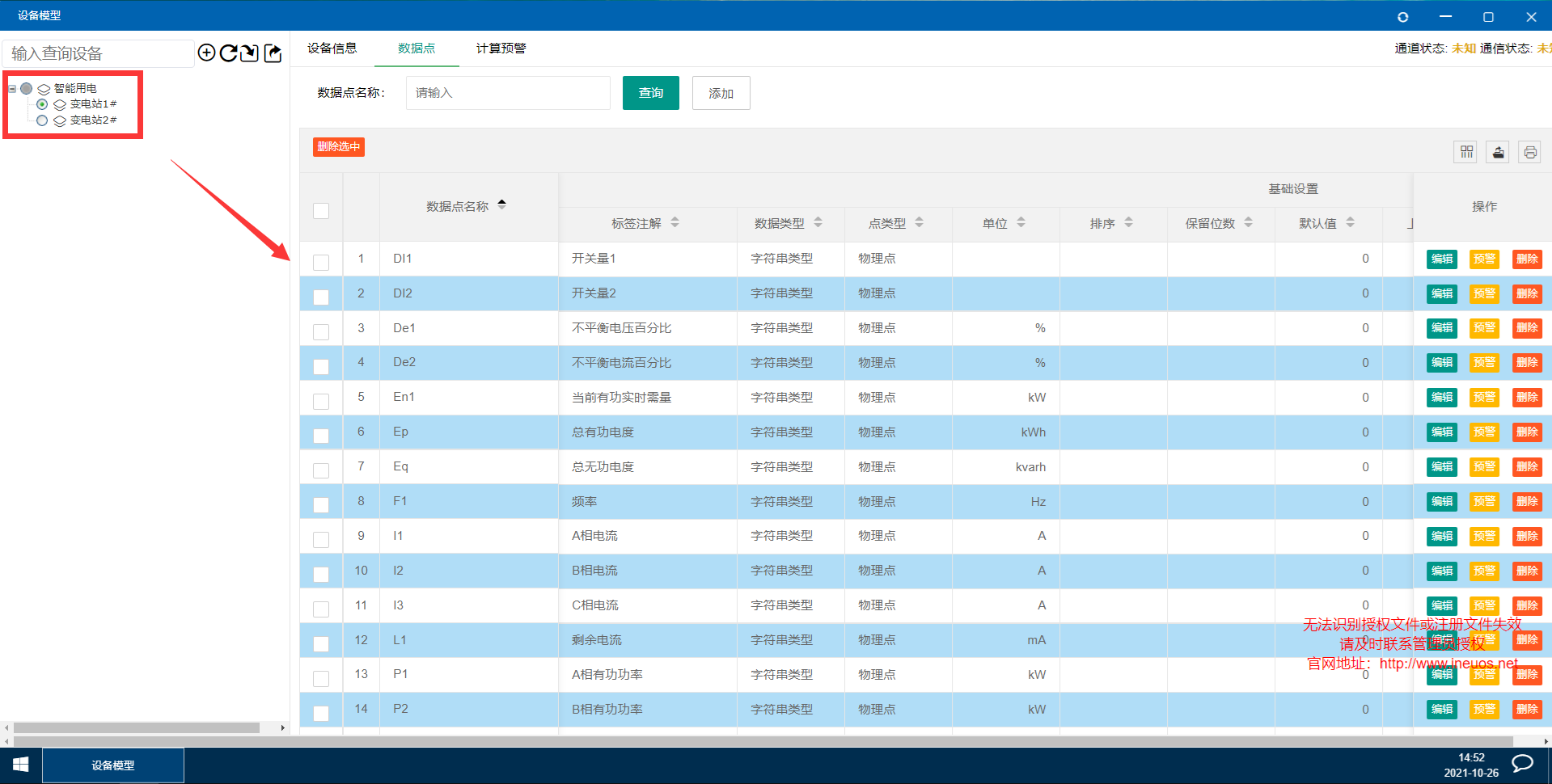 数据点管理,可以对数据点进行编辑、预警和计算,如下图: