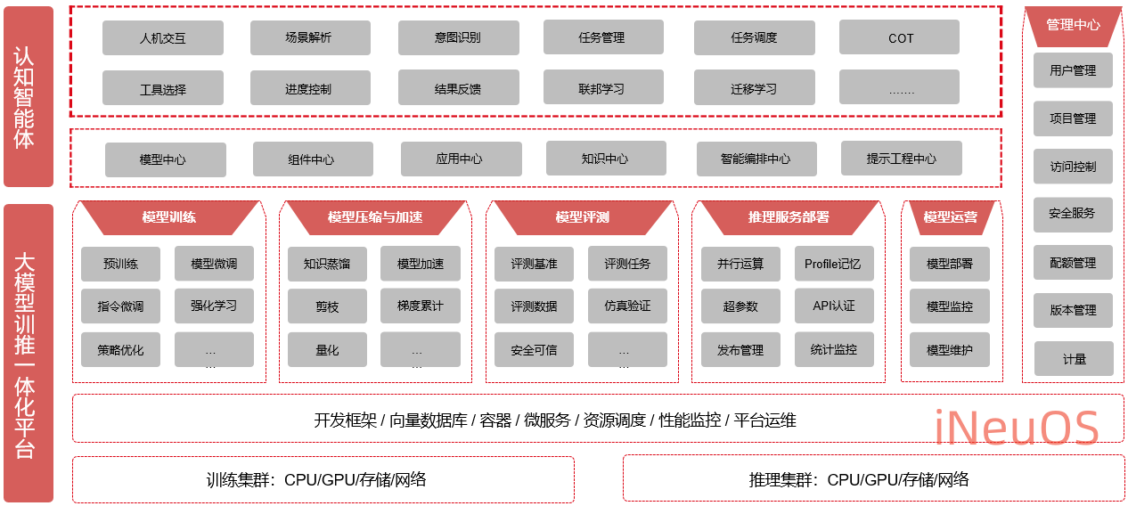 系统提供算力、算法、开发框架 /平台、训练数据集、标准场景算法一体化能力,助力企业快速搭建自身的 AI开发能力。
