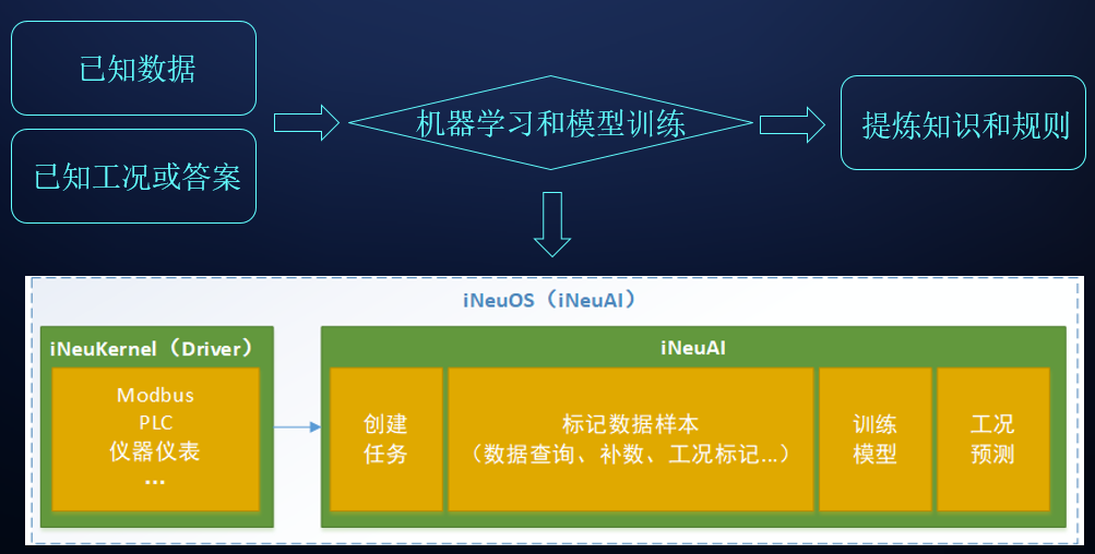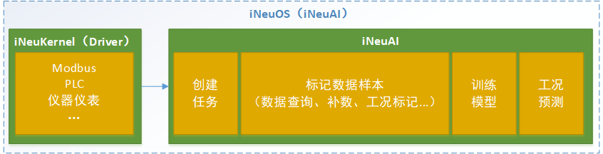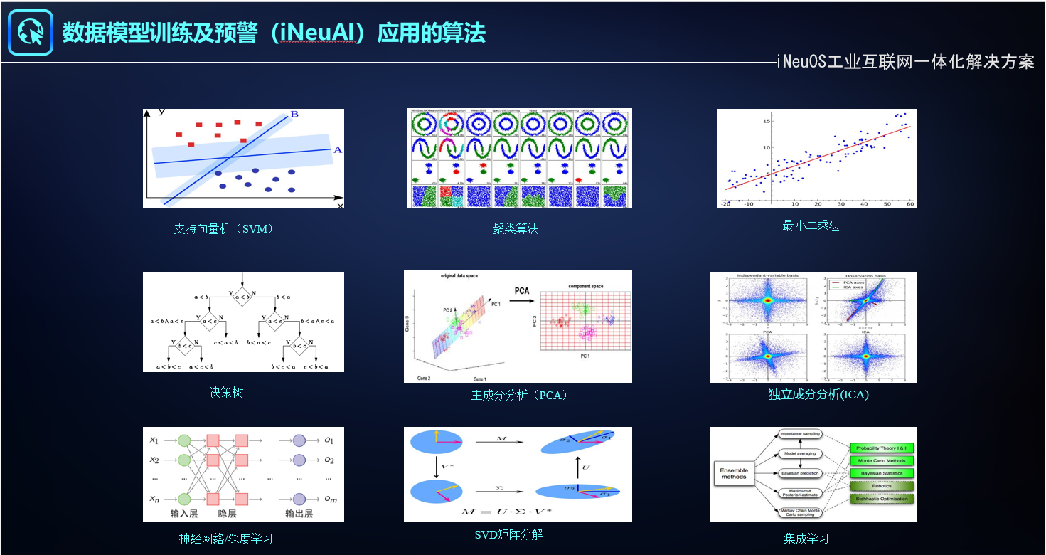 机器学习(iNeuML)和算法分析是iNeuOS的核心组件,对设备容器(iNeuKernel)设备运行容器产生的数据进行数据样本标记、数据算法模型训练、工况智能预警。iNeuAI要从体量巨大、结构繁多的数据中挖掘出潜藏在数据中的规律和知识,从而使数据发挥最大化的价值,是iNeuOS云端操作系统的一个核心目标。