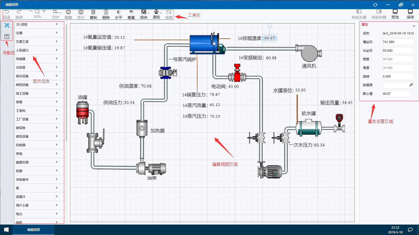 (7)文本框和图元都支持绑定数据源,根据数据源的实时数据值改变其显示状态和效果。