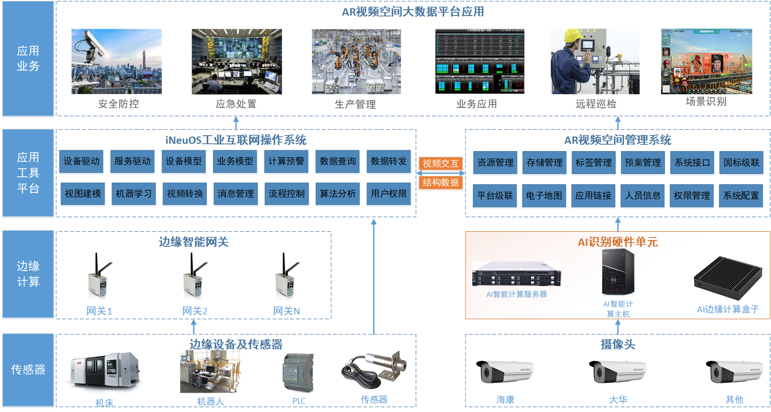 AI 视频图像场景识别系统可以接入海康、大华等通用摄像头的视频流数据,通过 AI 算法实时识别应用场景,并把 AI 视频图像识别结果和视频信息实时推送到平台端。系统应用框架示意如下图:
