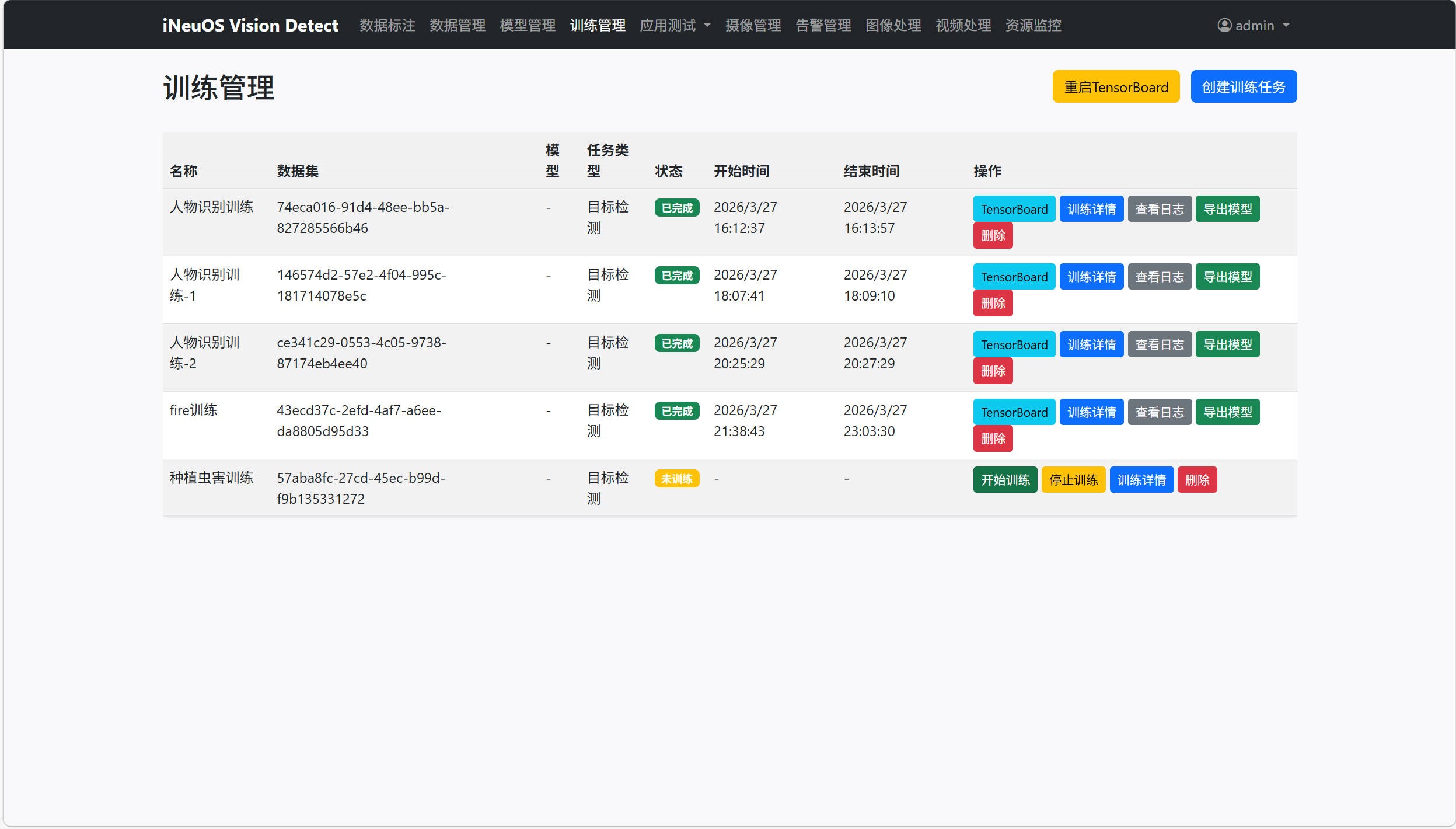 iNeuOS Vision Detect是面向机器视觉训练、测试、管理和应用的管理平台,覆盖数据标注、数据管理、模型管理、训练管理、应用测试、摄像管理、告警管理、图像处理、视频处理与资源监控等业务闭环。平台支持从数据到模型再到业务应用的全流程管理,可用于快速构建“可训练、可部署、可运营”的视觉智能系统。